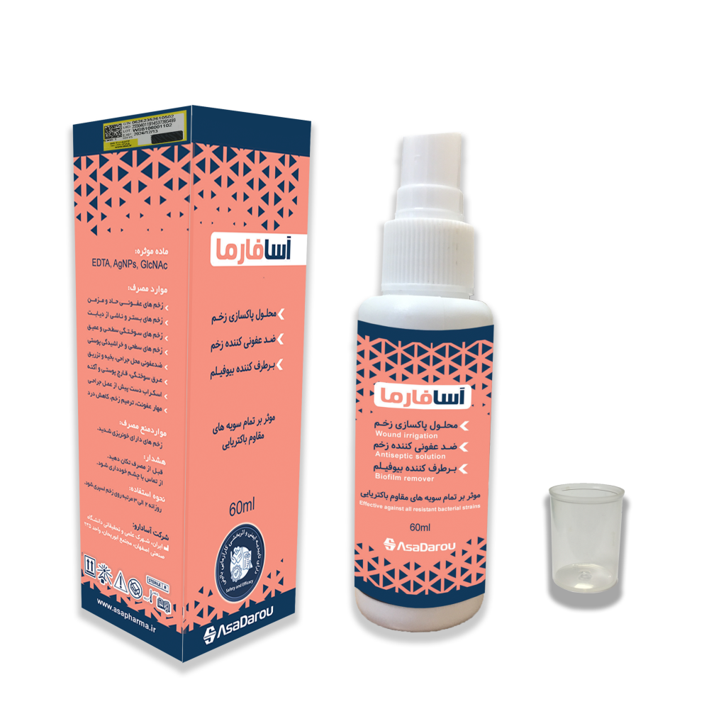 بزرگ ترین معضلات و نگرانی ها در ترمیم زخم تجمع میکروارگانیسم های مختلف و عفونت در محل زخم است. از این رو اولین قدم در مراقبت از زخم و شروع درمان، پاکسازی محل زخم می باشد. محلول پاکسازی و ضدعفونی کننده زخم و برطرف کننده بیوفیلم آسافارما یکی از محصولات شرکت آسادارو است که با استفاده از علم و فناوری اقدام به ارائه راهکارهای علمی به روز و موثر جهت حل مسائل درمان و مدیریت انواع زخم ها گام در عرصه تولید نهاده است. توجه به خواص بالقوه EDTA برای اولین بار در میان انبوه محصولات مشابه ترمیم زخم ، ویژگی خاص محصولات آسافارما است که منجر به دستیابی فرمولاسیون منحصر به فرد و متمایز گردیده و بطور خاص به انتخابی ایده آل برای زخم هایی که ترمیم آنها متوقف شده، تبدیل گشته است.